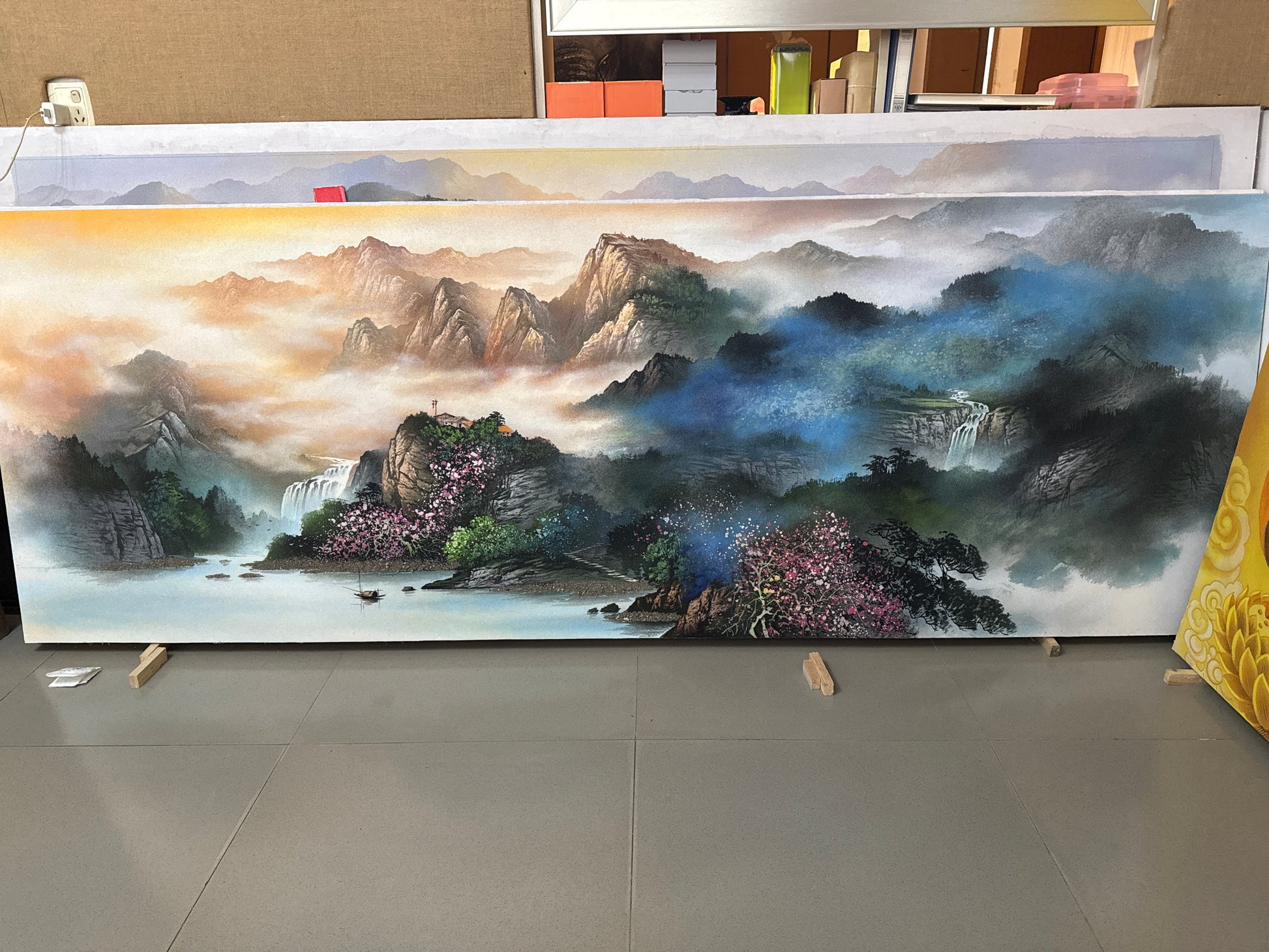 This stunning sand and stone painting brings to life the dynamic beauty of a mountain waterfall, crafted by skilled Tujia artisans using natural materials such as colored sand, crushed stone, and minerals. The artwork captures the raw energy of cascading water, the serene stillness of surrounding cliffs, and the lush greenery that frames the scene.
