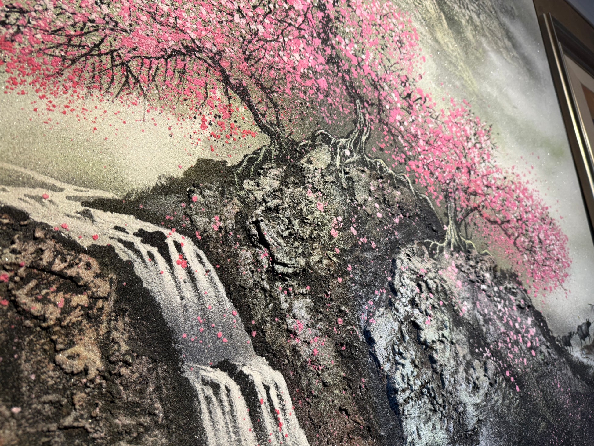 The textured layers of sand and stone recreate the rugged contours of the mountains, the soft petals of the peach blossoms, and the shimmering surface of the waterfall. Subtle gradients evoke the play of light on rock and water, while the earthy tones and soft pinks create a harmonious balance between strength and serenity.